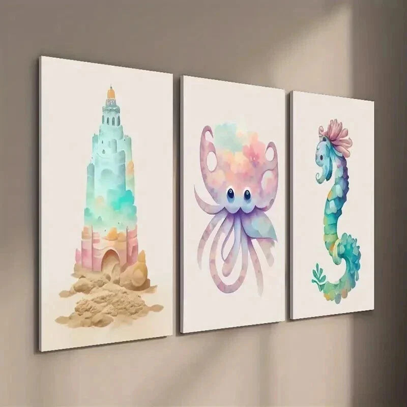 3pcs Sandstone Castle Octopus Seahorse Wall Art Set Canvas Framed 40x60cm - High Quality Print 100% Australian Made Wall Canvas Ready to Hang