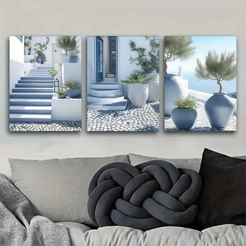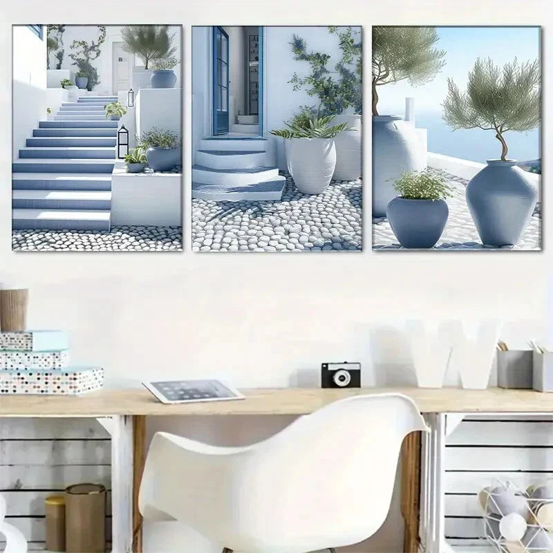 3pcs Santorini Blue And White Mediterranean Metal Print Ready to Hang Art