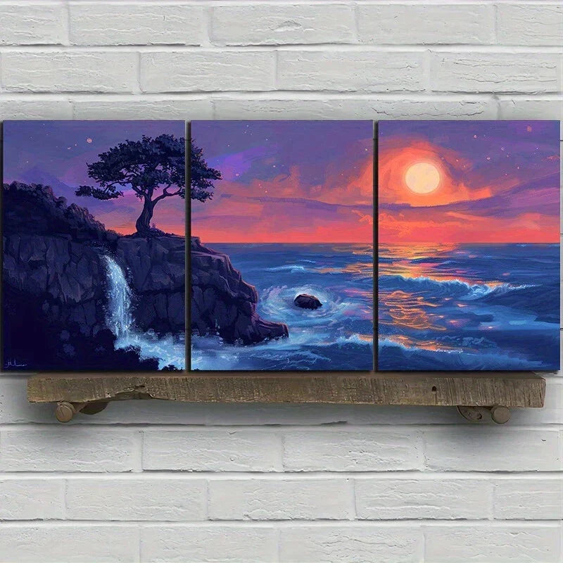 3pcs Sea Sunset Tree Waves Stones Metal Print Ready to Hang Art
