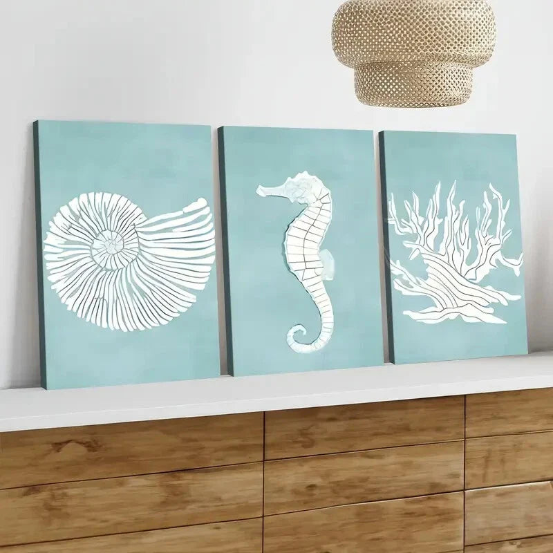 3pcs Seahorses Corals & Shells Ocean Life Blue Wall Art Set Canvas Framed 40x60cm - High Quality Print 100% Australian Made Wall Canvas Ready to Hang