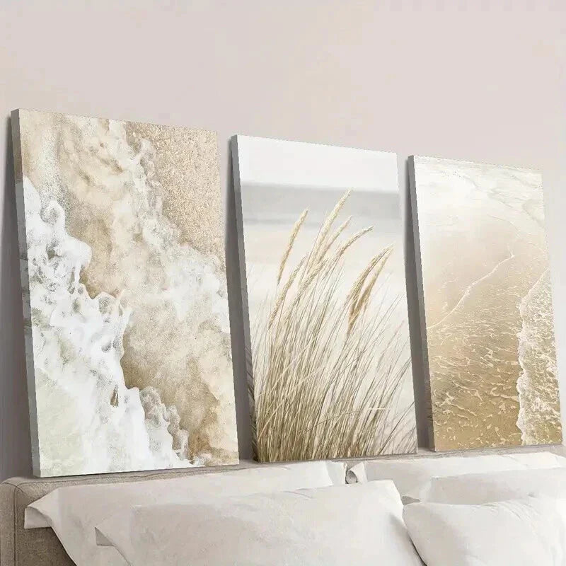 3pcs Seaside Plant Painting Beige Wavy Style Wall Art Set Canvas Framed 40x60cm - High Quality Print 100% Australian Made Wall Canvas Ready to Hang