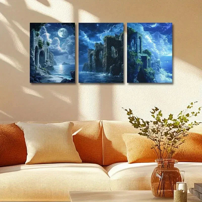 3pcs Seaside site with Moon View Design Metal Print Ready to Hang Art