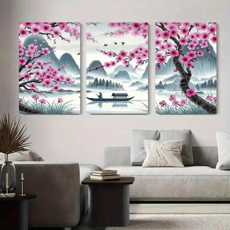 3pcs Serene Cherry Blossom River Boat Scene Metal Print Ready to Hang Art