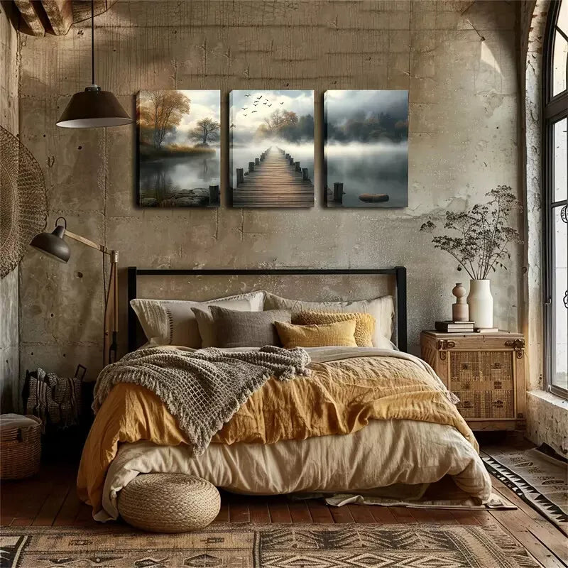 3pcs Serene Lake & Wooden Bridge Triptych Wall Art Set Canvas Framed 40x60cm - High Quality Print 100% Australian Made Wall Canvas Ready to Hang