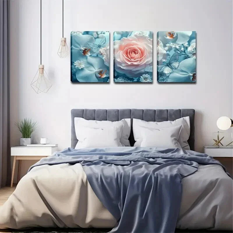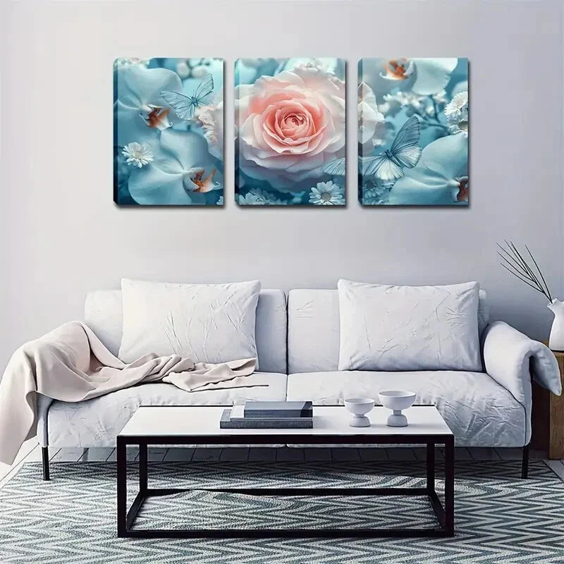 3pcs Serene Light Blue Floral & Butterfly Design Wall Art Set Canvas Framed 40x60cm - High Quality Print 100% Australian Made Wall Canvas Ready to Hang