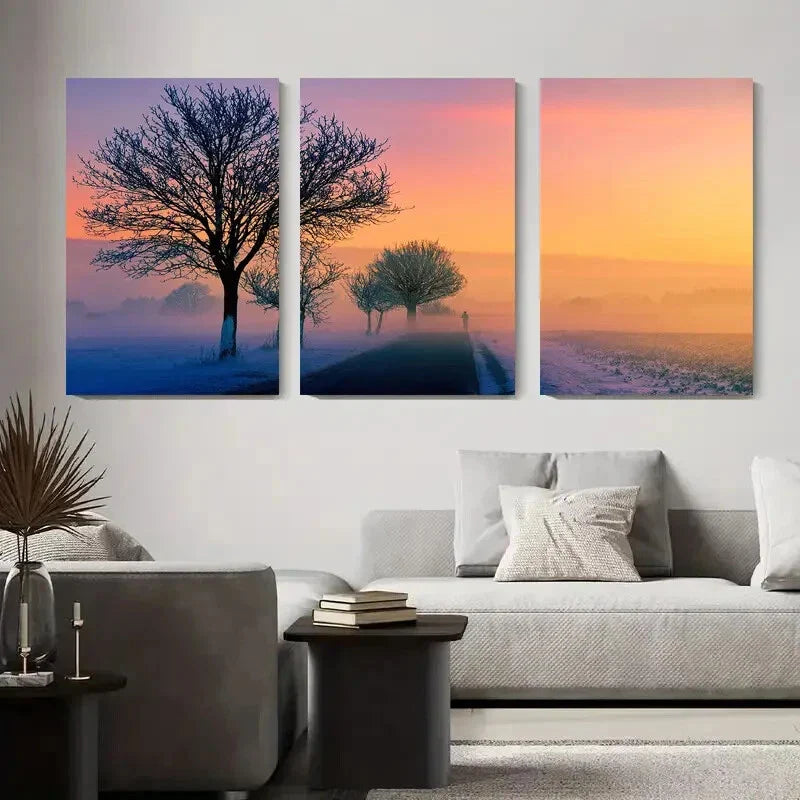 3pcs Serene Snowy Road & Foggy Trees Metal Print Ready to Hang Art
