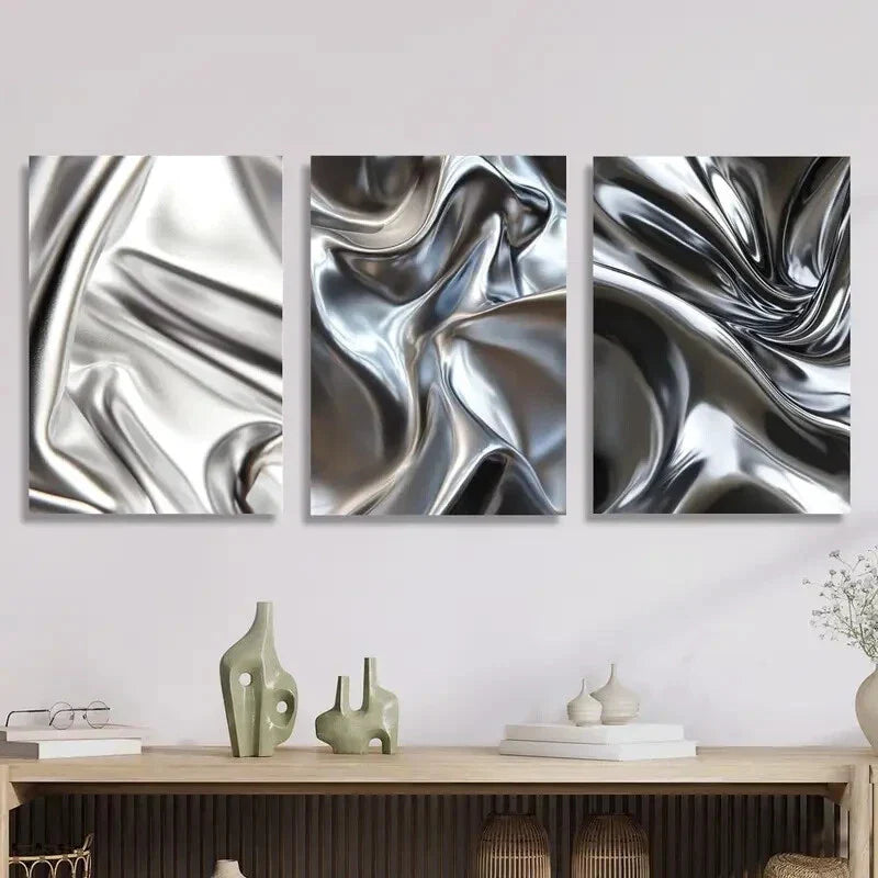 3pcs , Silver Glossy Liquid Metal Style Metal Print Ready to Hang Art