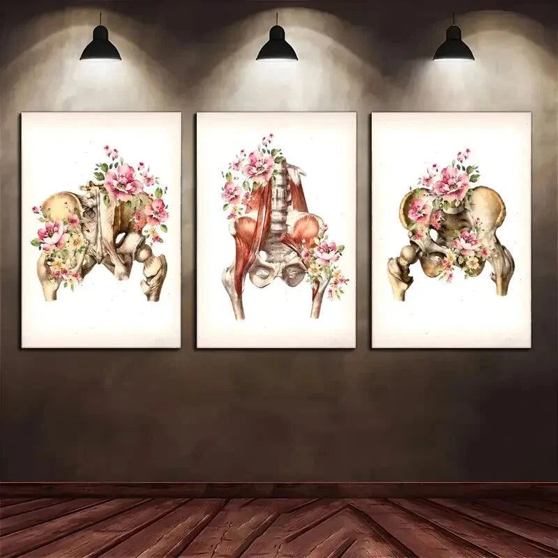 3pcs Skeleton and Flowers Portrait Anatomy Prints Metal Print Ready to Hang Art