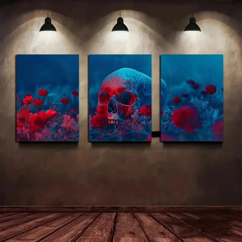 3pcs Skeleton and Flowers Red Blue Metal Print Ready to Hang Art