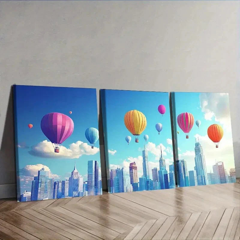 3pcs Skyscrapers and hot air balloons Wall Art Set Canvas Framed 40x60cm - High Quality Print 100% Australian Made Wall Canvas Ready to Hang
