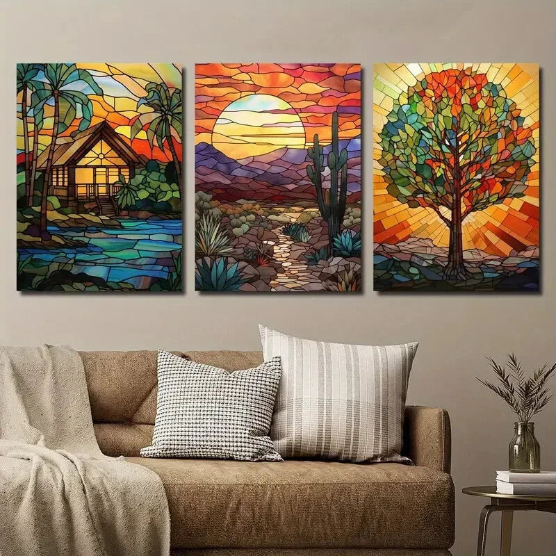 3pcs Stained Glass Style Village Desert Sunset Metal Print Ready to Hang Art