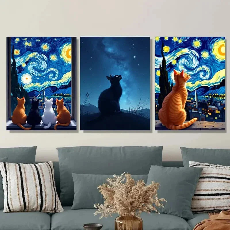 3pcs Starry Night Cat Modern Metal Print Ready to Hang Art