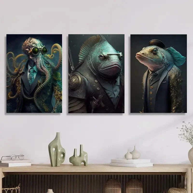 3pcs Steampunk Octopus & Fish Warrior Metal Print Ready to Hang Art