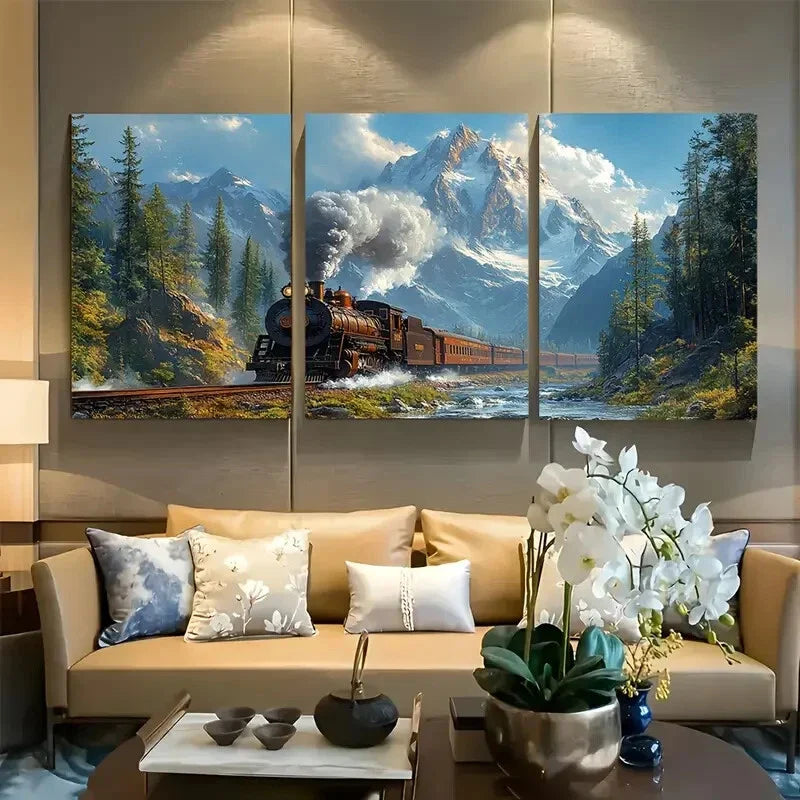 3pcs Steampunk Train In The Mountains Metal Print Ready to Hang Art