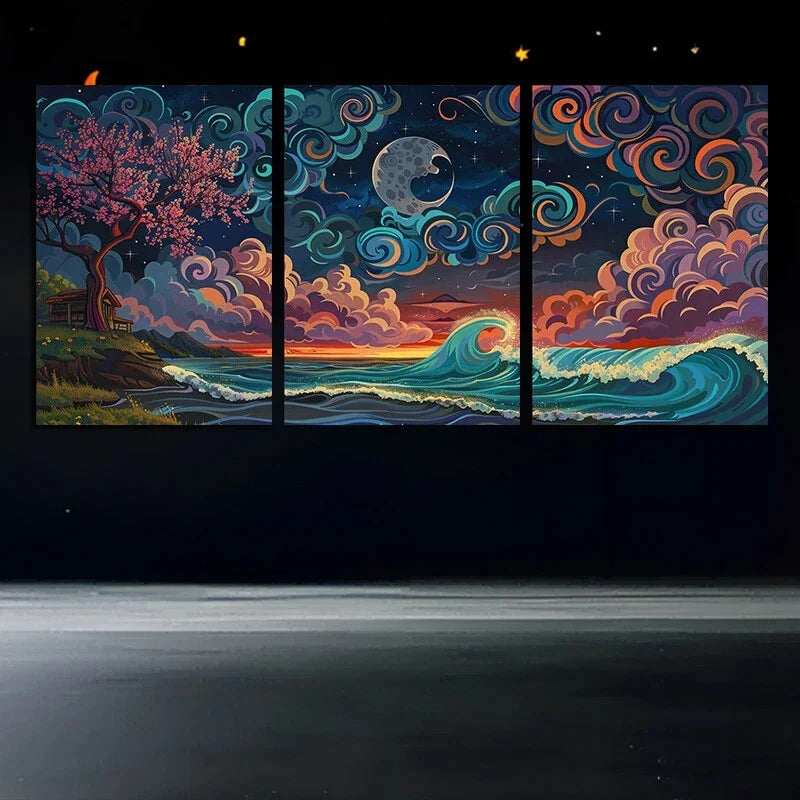 3pcs Storm Night Vibrant Abstract Ocean and Tree Metal Print Ready to Hang Art
