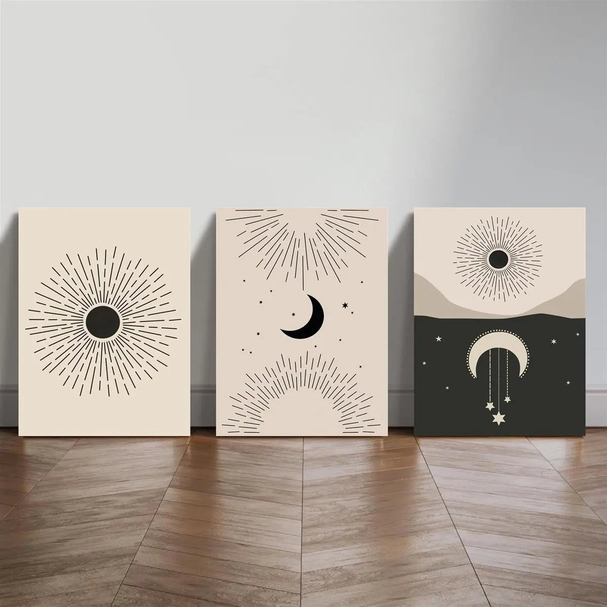 3pcs Sun, Moon & Stars, Contemporary Bohemian Gallery Metal Print Ready to Hang Art