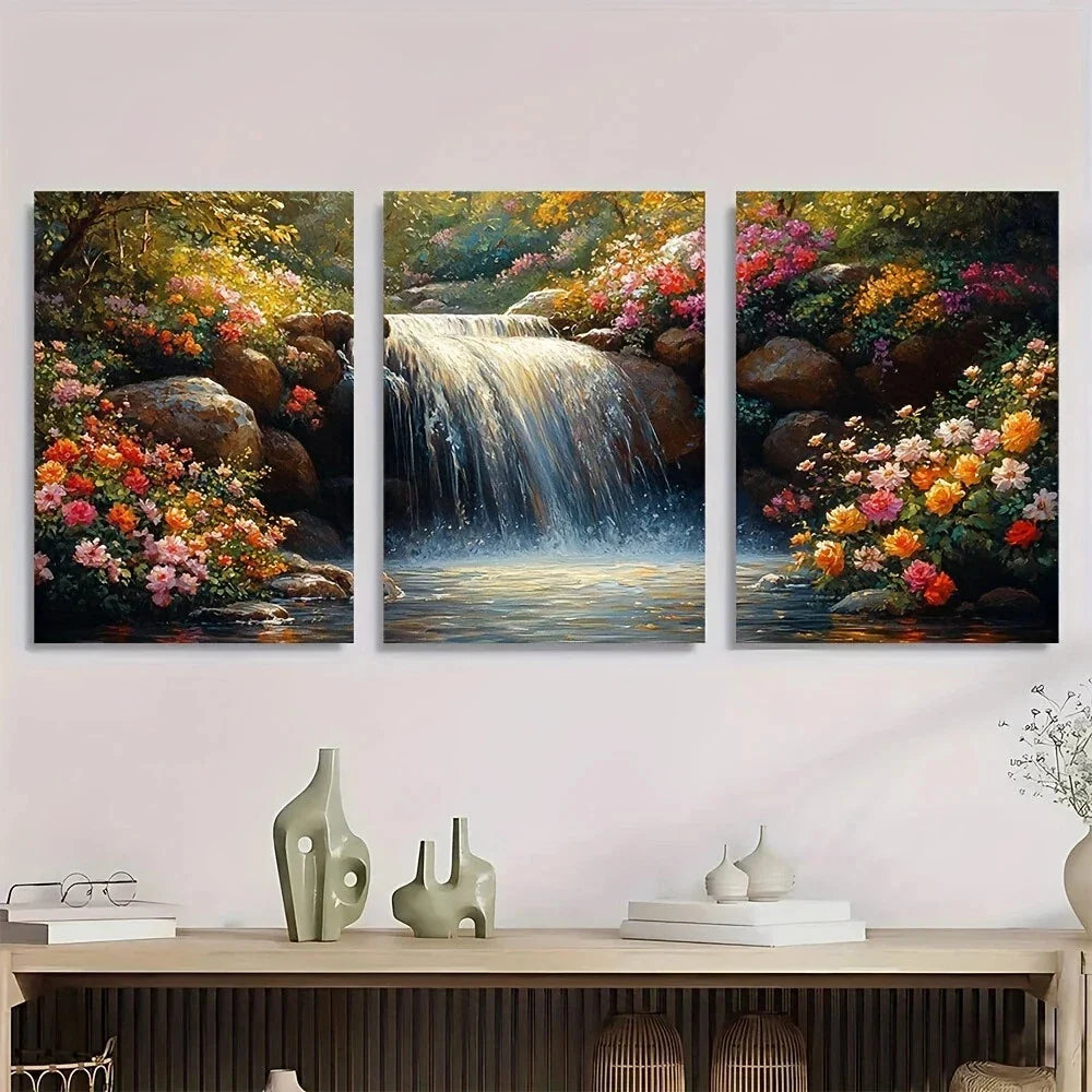3pcs Sunlit Waterfall Vibrant Floral & Greenery Metal Print Ready to Hang Art