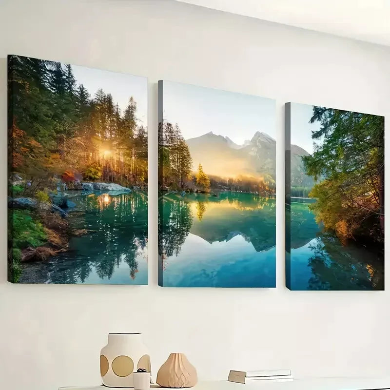 3pcs Sunrise Mountains, Forest, Lake Reflections Wall Art Set Canvas Framed 40x60cm - High Quality Print 100% Australian Made Wall Canvas Ready to Hang
