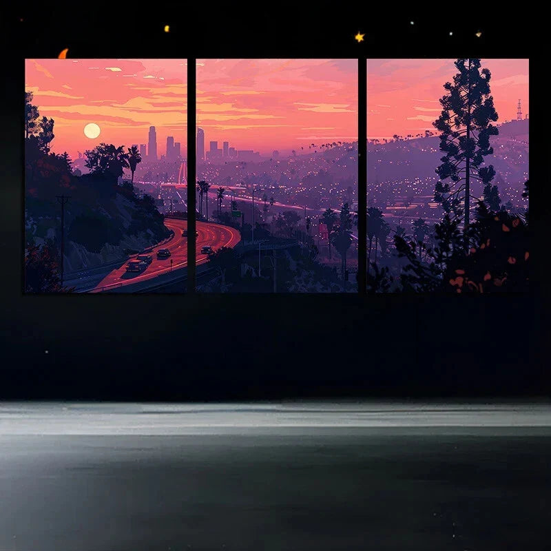 3pcs Sunset Cityscape Highway and Skyline Metal Print Ready to Hang Art