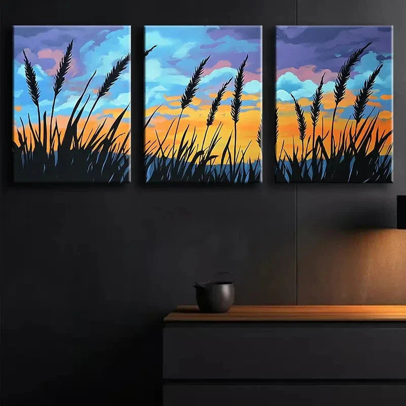 3pcs Sunset Grass Silhouettes Shine Nature Wall Art Set Canvas Framed 40x60cm - High Quality Print 100% Australian Made Wall Canvas Ready to Hang