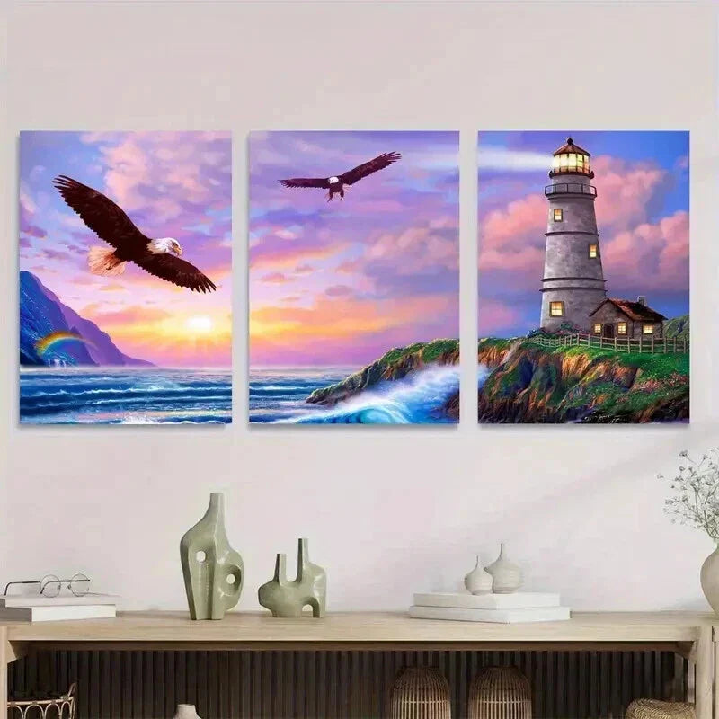 3pcs Sunset Lighthouse & Eagles Triptych Wall Art Set Canvas Framed 40x60cm - High Quality Print 100% Australian Made Wall Canvas Ready to Hang