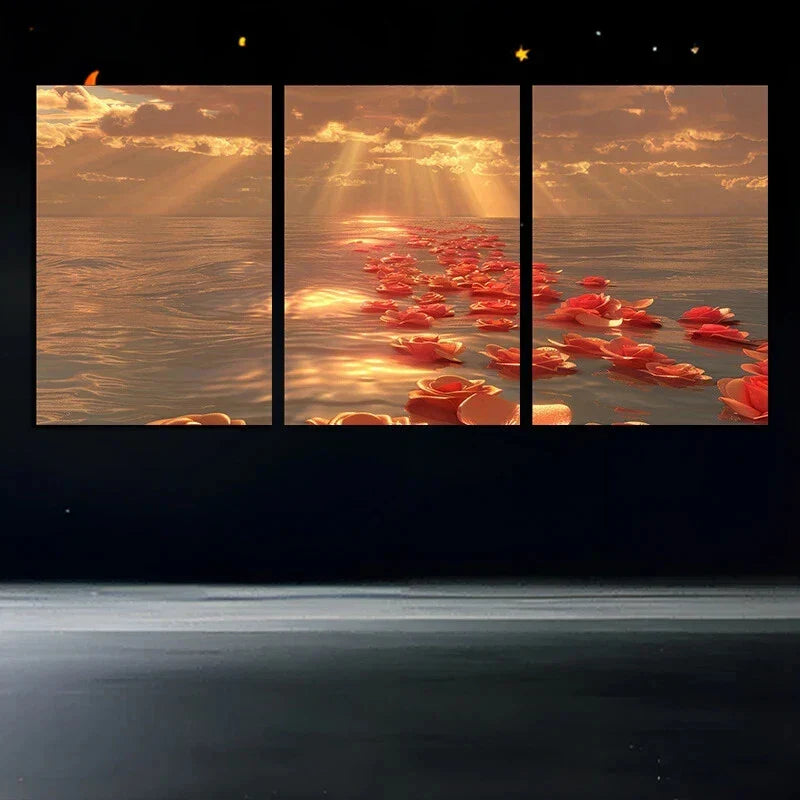 3pcs Sunset River Rose Petal Design Metal Print Ready to Hang Art