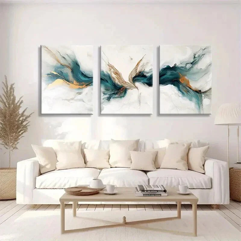 3pcs Teal, White, and Golden Abstract Wave Design Metal Print Ready to Hang Art