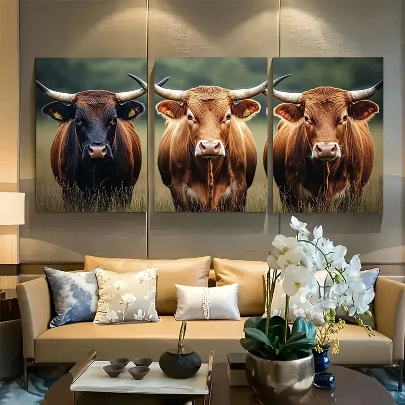 3pcs Texas Brown Longhorn Cattle Close Up Metal Print Ready to Hang Art