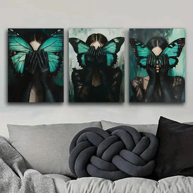 3pcs The Woman with The Green Butterfly On Face Metal Print Ready to Hang Art