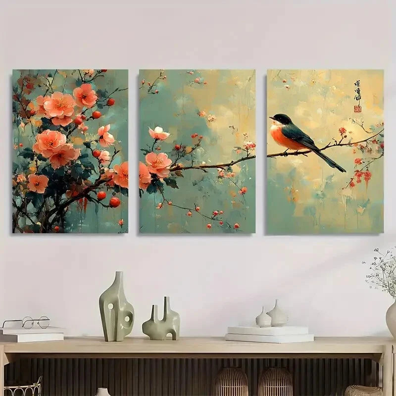 3pcs Traditional Chinese Style Green Flowers Metal Print Ready to Hang Art