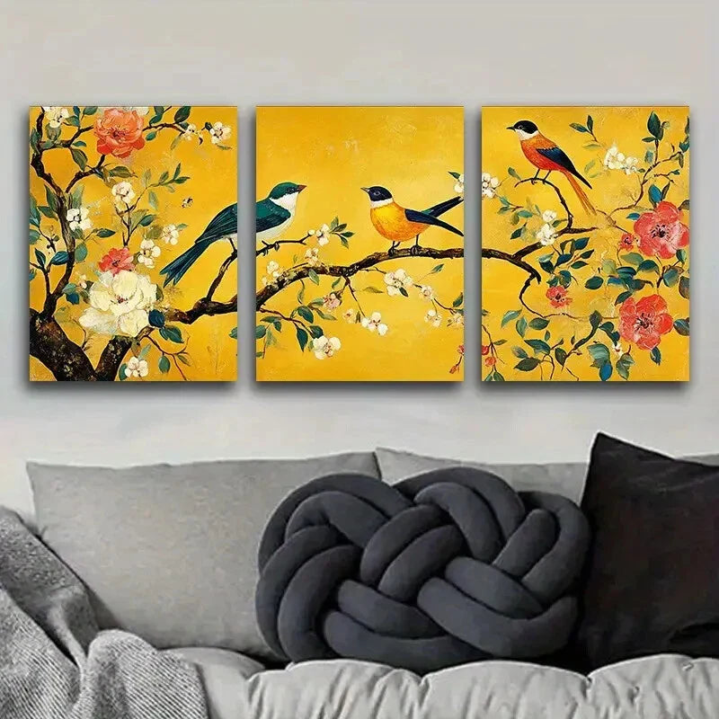 3pcs Tree of Life Adorned with Birds and Flowers Metal Print Ready to Hang Art
