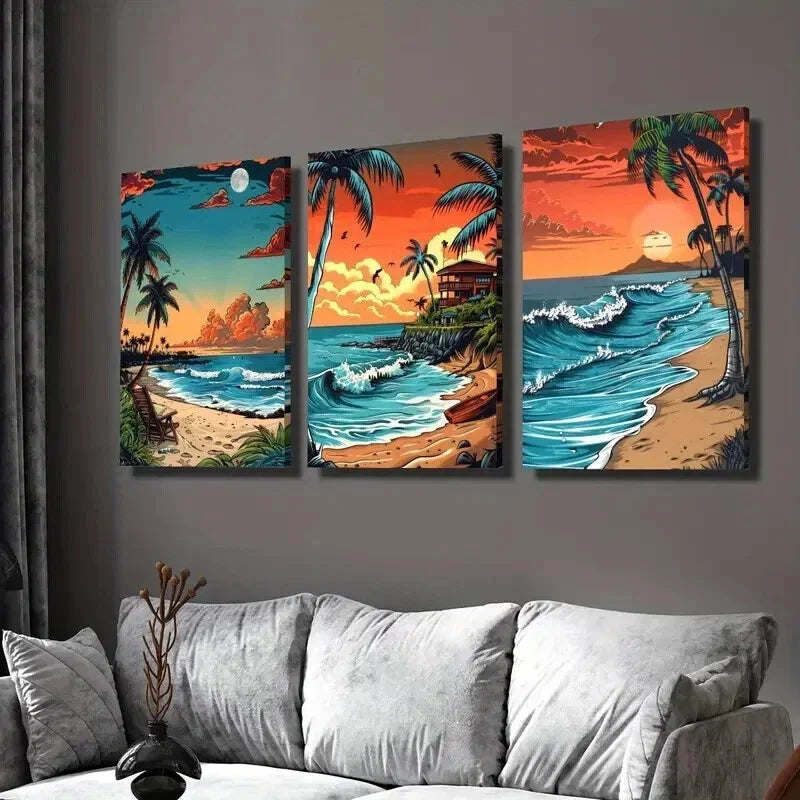 3pcs Tropical Beach Seascape Illustration Wall Art Set Canvas Framed 40x60cm - High Quality Print 100% Australian Made Wall Canvas Ready to Hang