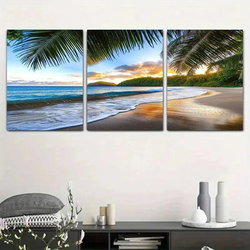 3pcs Tropical Beach Sunset Palm Tree & Ocean Waves Metal Print Ready to Hang Art