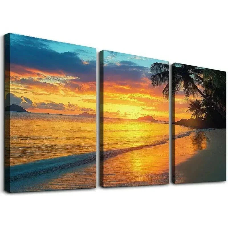 3pcs Tropical Beach Sunset with Palm Trees Wall Art Set Canvas Framed 40x60cm - High Quality Print 100% Australian Made Wall Canvas Ready to Hang