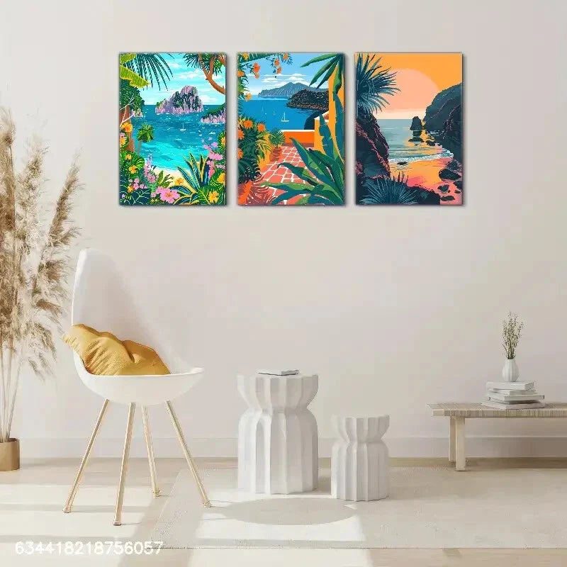 3pcs Tropical Palm Trees, Ocean Waves Metal Print Ready to Hang Art