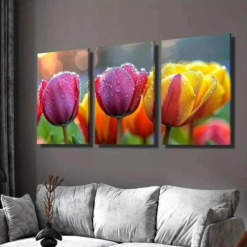 3pcs Tulips in the Rain Floral Themed Wall Art Set Canvas Framed 40x60cm - High Quality Print 100% Australian Made Wall Canvas Ready to Hang