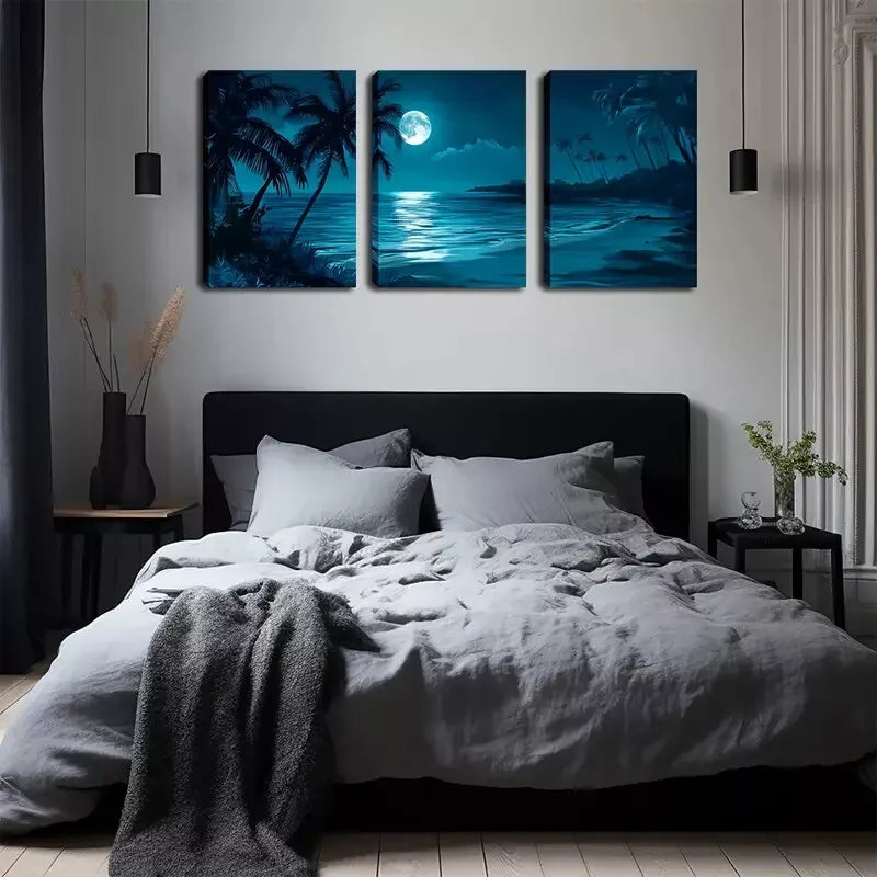 3pcs Under The Night, Coconut Trees, Beaches Wall Art Set Canvas Framed 40x60cm - High Quality Print 100% Australian Made Wall Canvas Ready to Hang