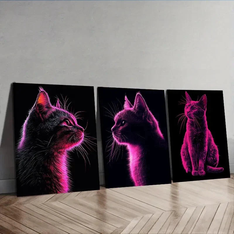 3pcs Vector illustration cat In Dark Background Wall Art Set Canvas Framed 40x60cm - High Quality Print 100% Australian Made Wall Canvas Ready to Hang