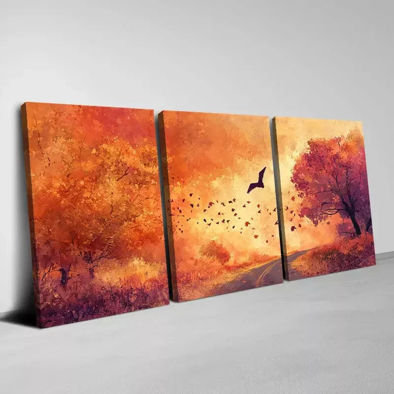3pcs Vibrant Autumn Path, Trees & Bats Scene Wall Art Set Canvas Framed 40x60cm - High Quality Print 100% Australian Made Wall Canvas Ready to Hang