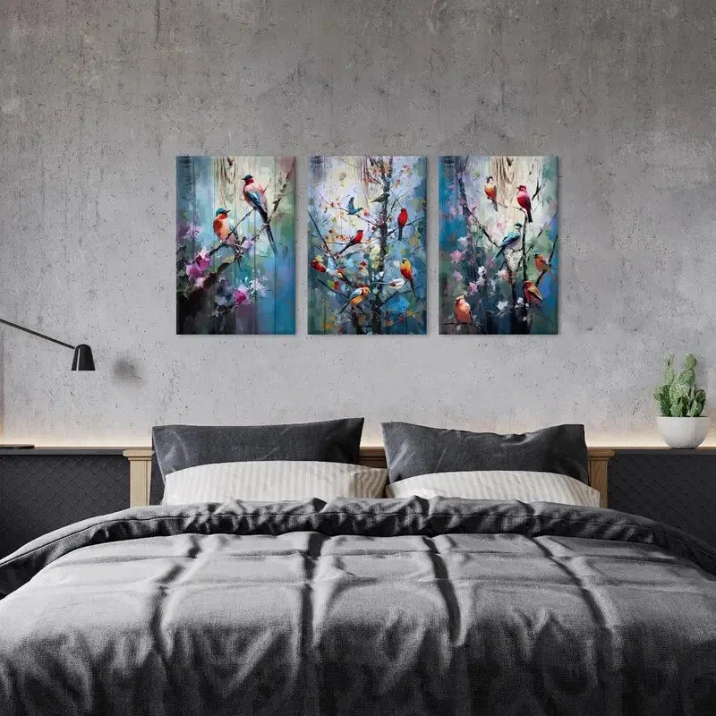 3pcs Vibrant Bird & Floral Colorful Abstract Metal Print Ready to Hang Art