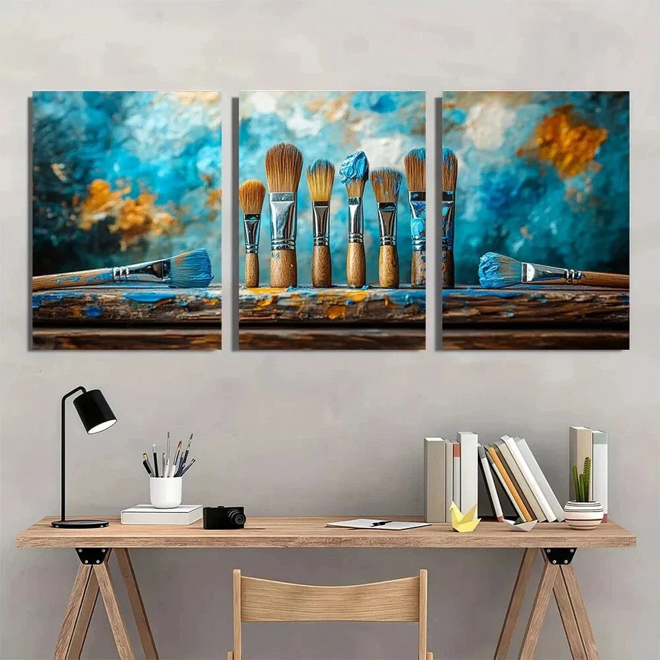 3pcs Vibrant Blue and Orange Paint Brushes Metal Print Ready to Hang Art