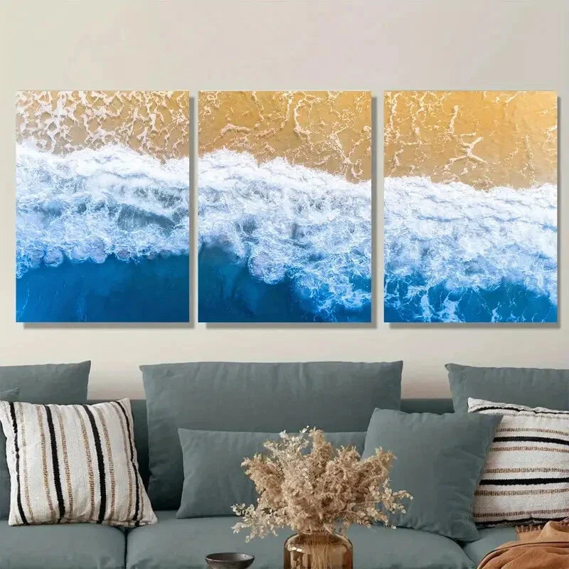 3pcs Vibrant Blue & Golden Sunset Beach Scene Metal Print Ready to Hang Art