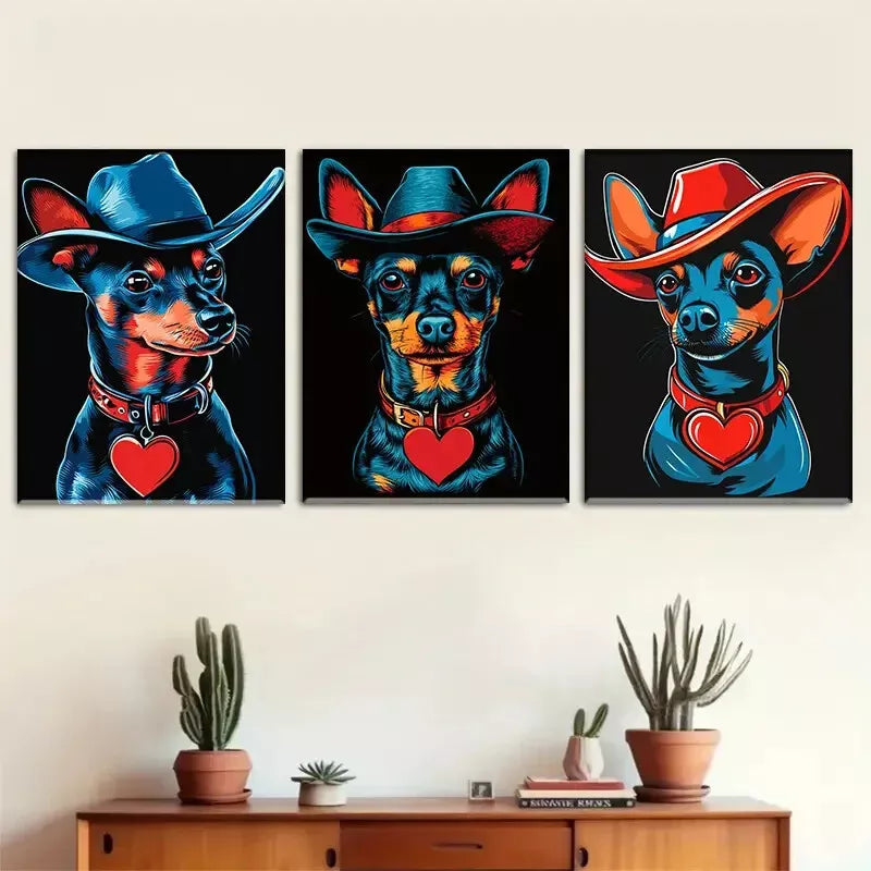 3pcs Vibrant Blue & Red Cowboy-Themed Dog Wall Art Set Canvas Framed 40x60cm - High Quality Print 100% Australian Made Wall Canvas Ready to Hang