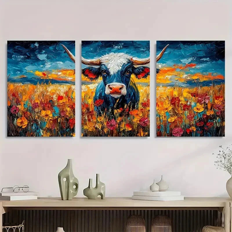 3pcs Vibrant Blue & White Cow In Wildflower Metal Print Ready to Hang Art