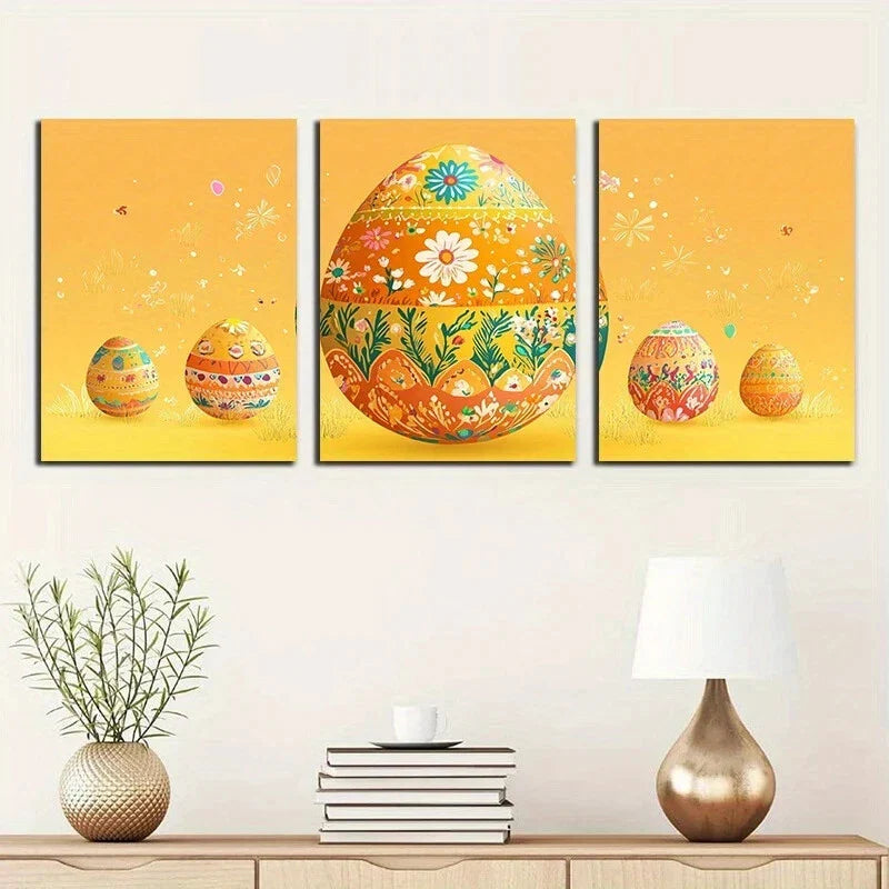 3pcs Vibrant Colorful Eggs Orange Florals Designs Metal Print Ready to Hang Art