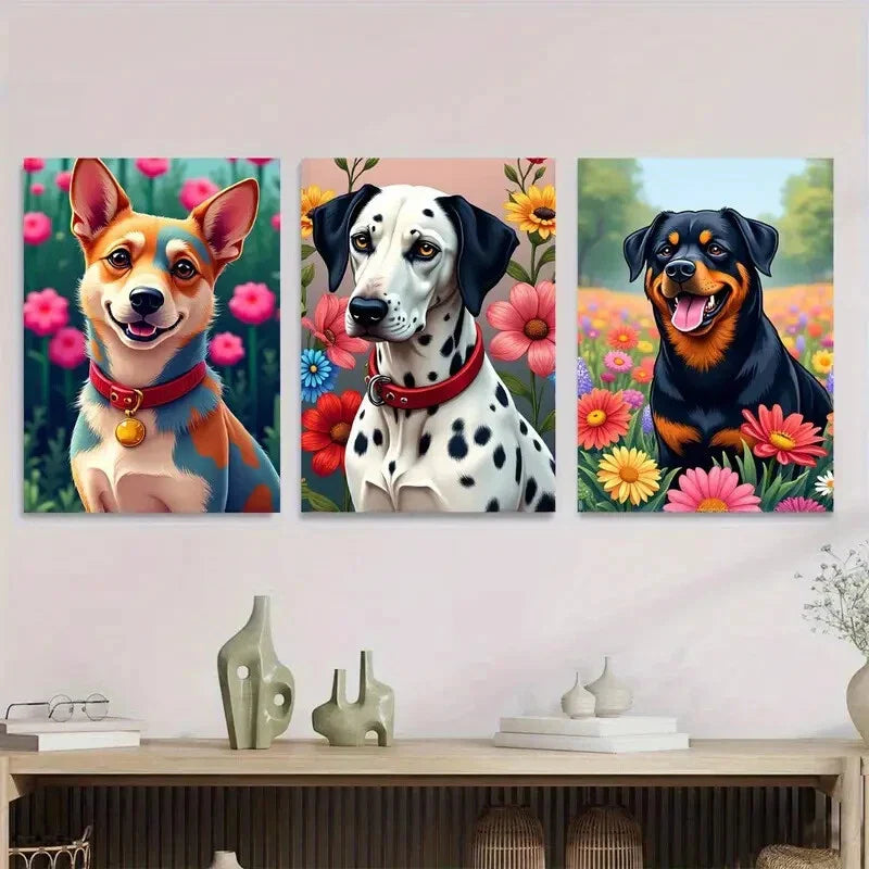 3pcs Vibrant Dog Colorful Pet Paintings Floral Wall Art Set Canvas Framed 40x60cm - High Quality Print 100% Australian Made Wall Canvas Ready to Hang