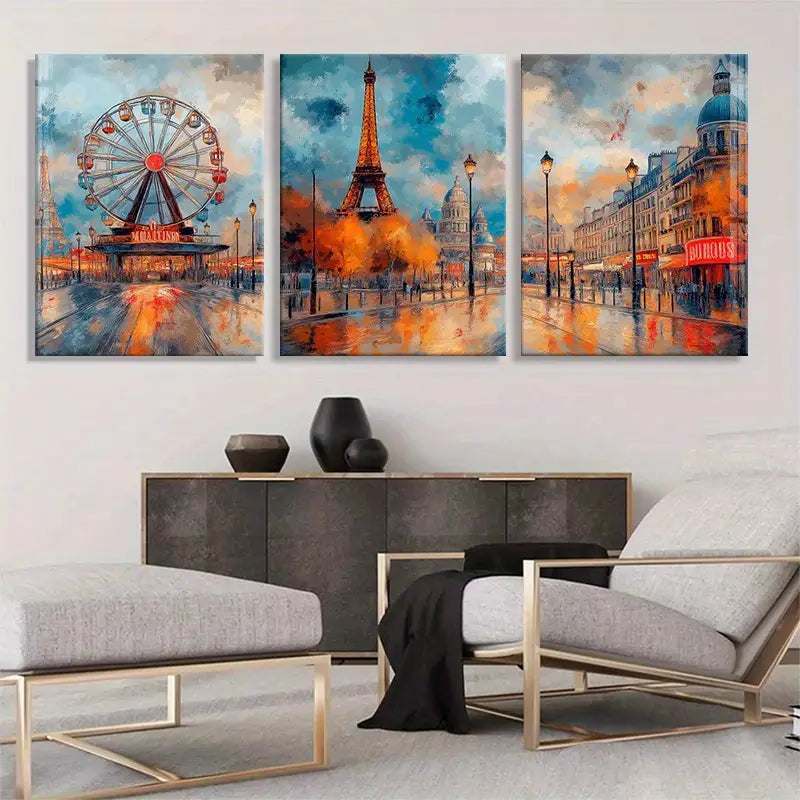 3pcs Vibrant Eiffel Tower, Ferris Wheel and French Streets Metal Print Ready to Hang Art