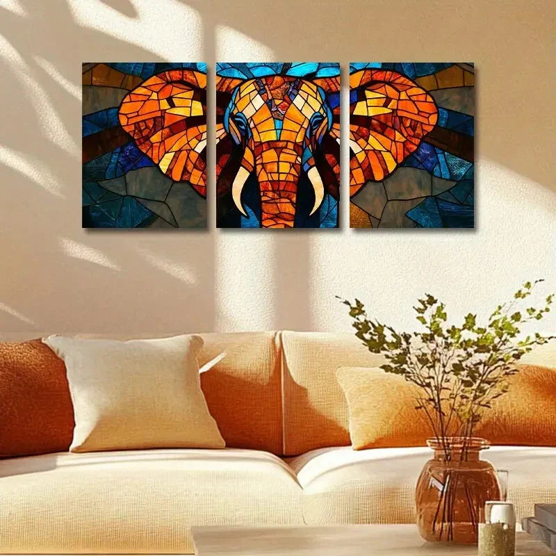 3pcs Vibrant Elephant Stained Glass Style Metal Print Ready to Hang Art