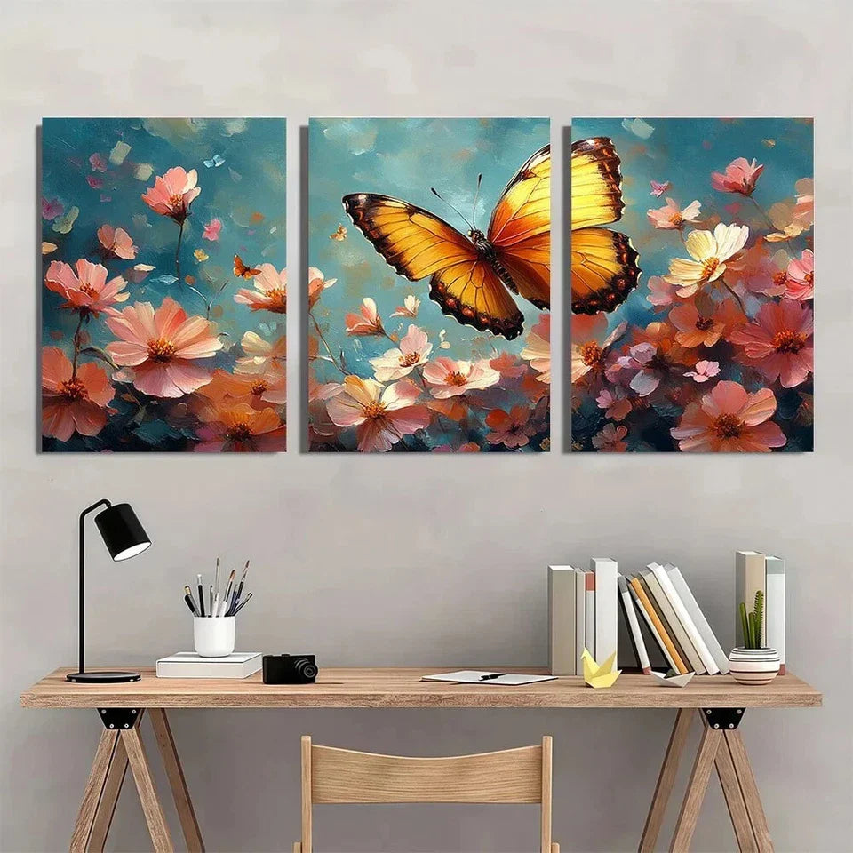 3pcs Vibrant Floral and Butterfly Metal Print Ready to Hang Art