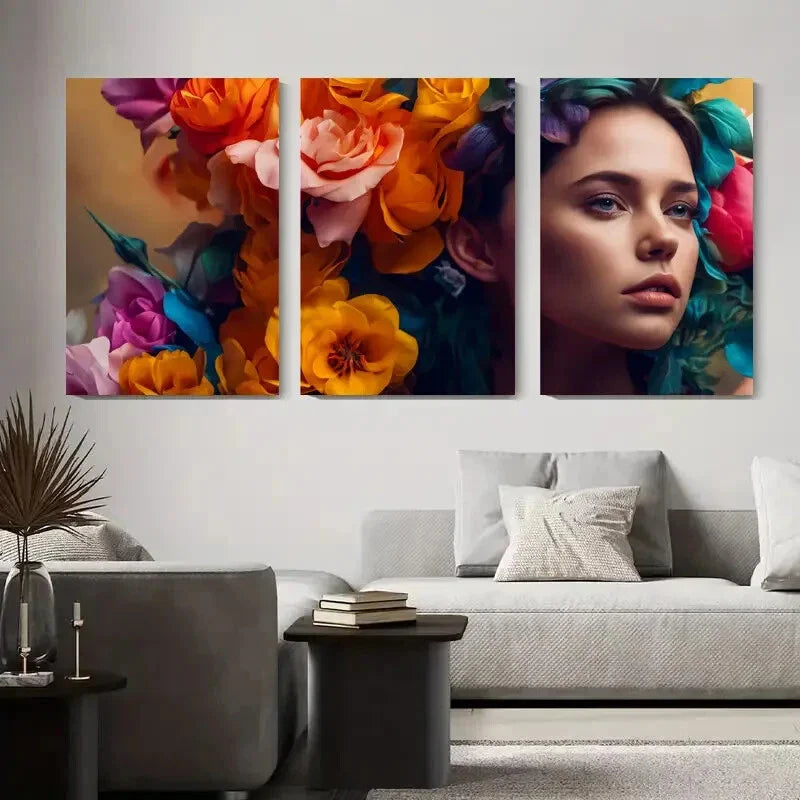 3pcs Vibrant Floral Crowned Woman Metal Print Ready to Hang Art